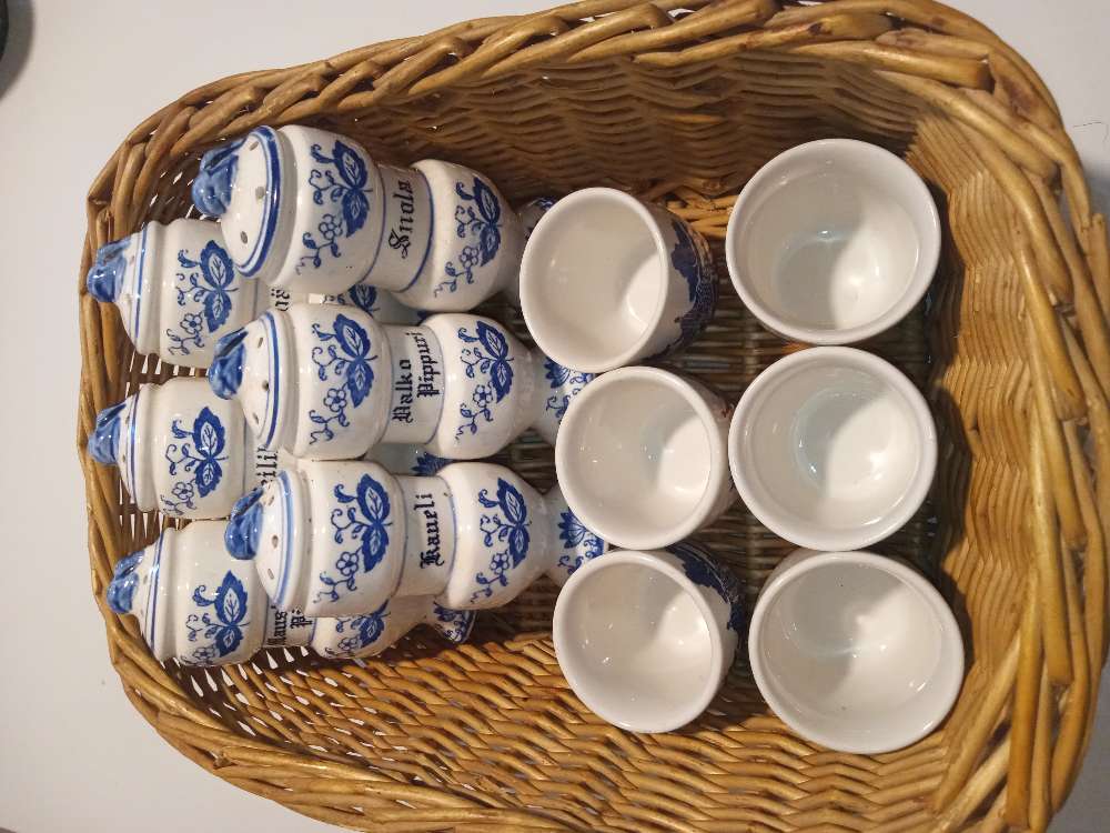 6 koristemaustepurkkia ja 6 pientä astiaa korissa