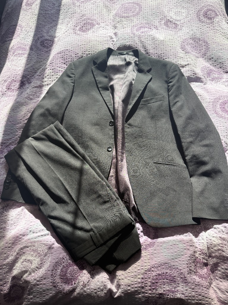 Buxur stærð 32 Jakki stærð small-medium Jakkafatapoki og 2 bindi fylgja með.