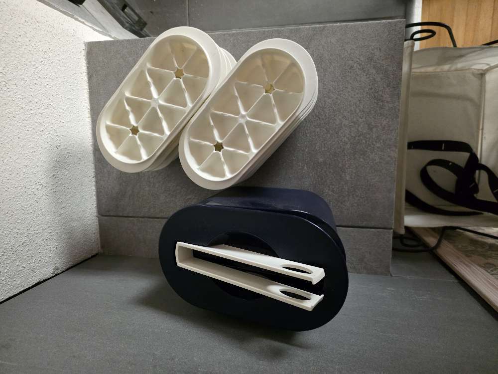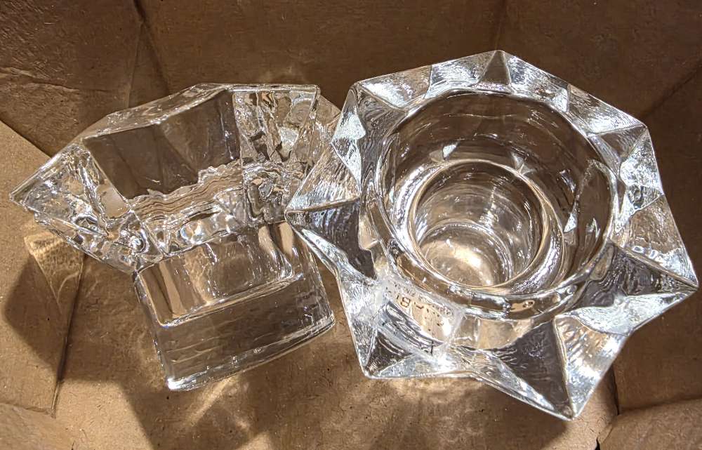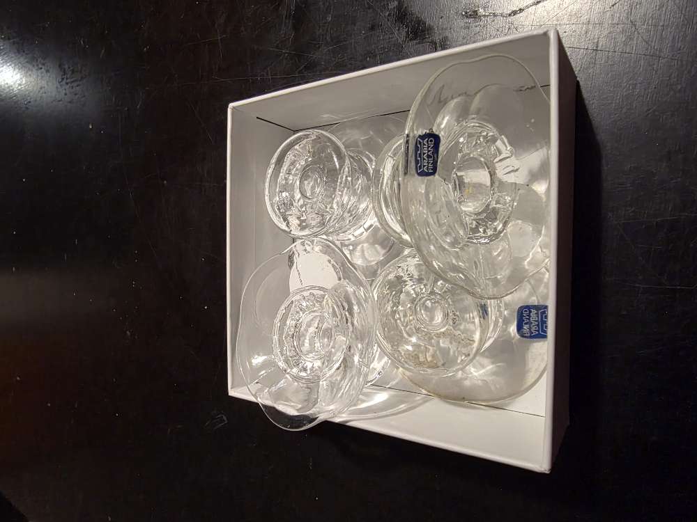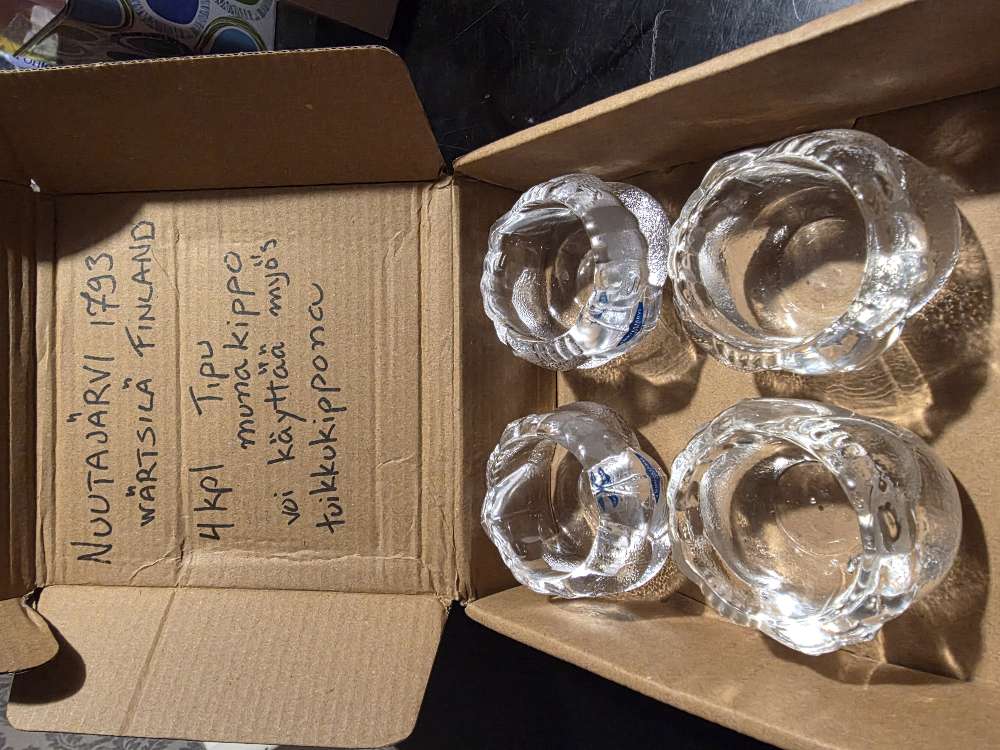 6 koristemaustepurkkia ja 6 pientä astiaa korissa