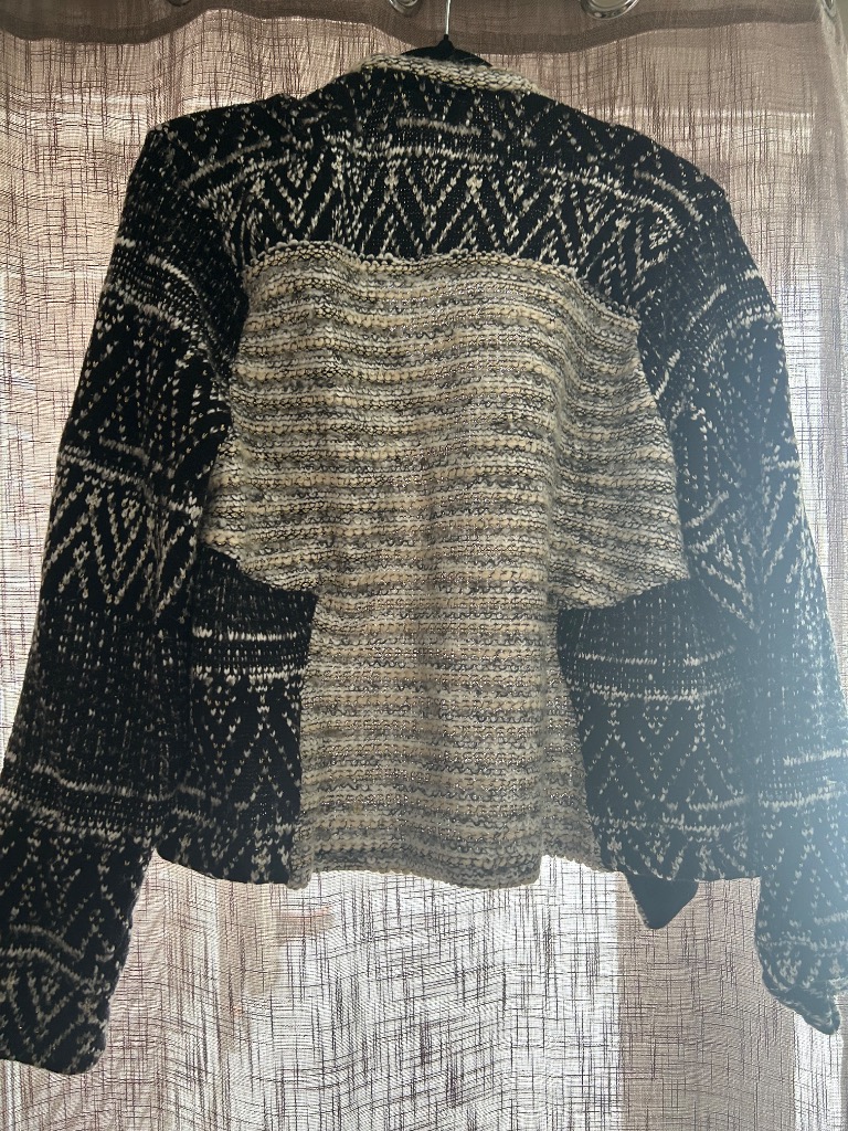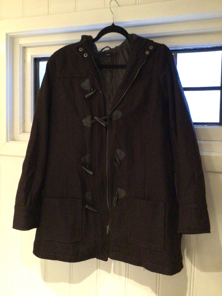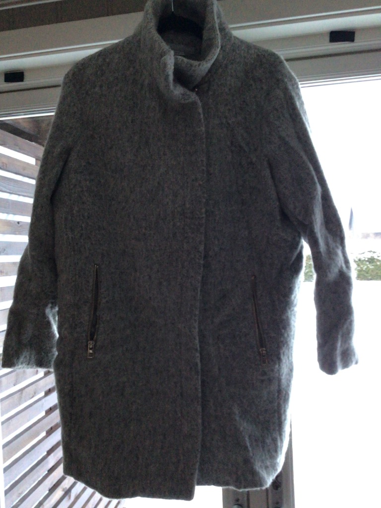 Þykkur stuttur frakki með pleður olnbogabótum og vasaklút.